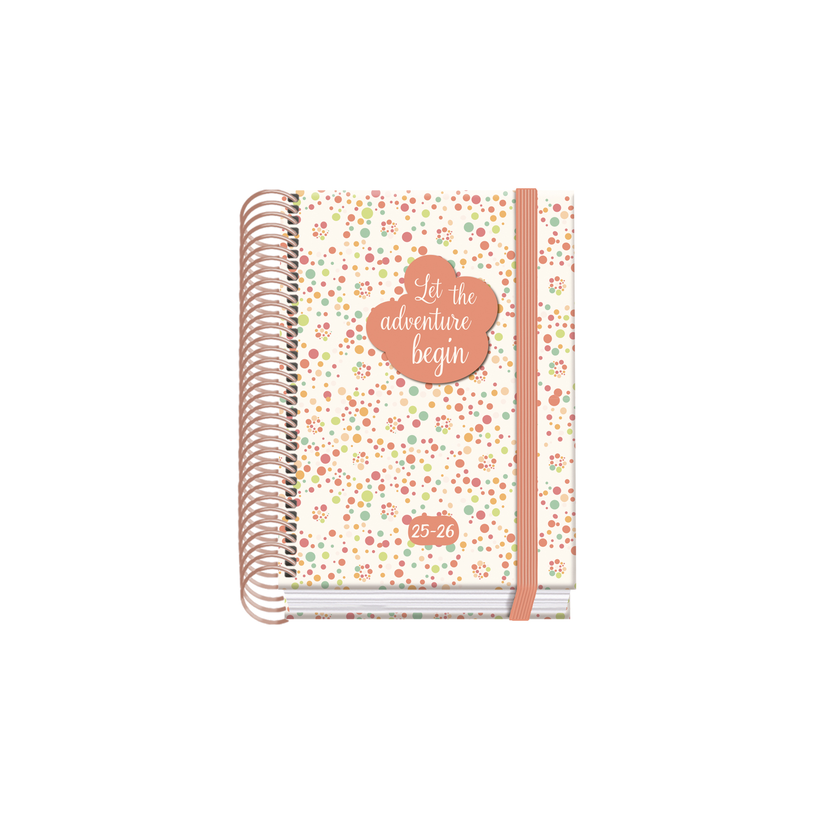 Agenda escolar 2025-2026 día página con cubierta en cartón forrado con papel impreso a todo color y plastificado. Guarda impresas. Encuadernada en espiral de plástico y cierre de goma elástica plana de color. Interior impresos en papel offset de 70 gramos y 4 hojas de pegatinas impreso a todo color. Con Certificado FSC Mixto.
