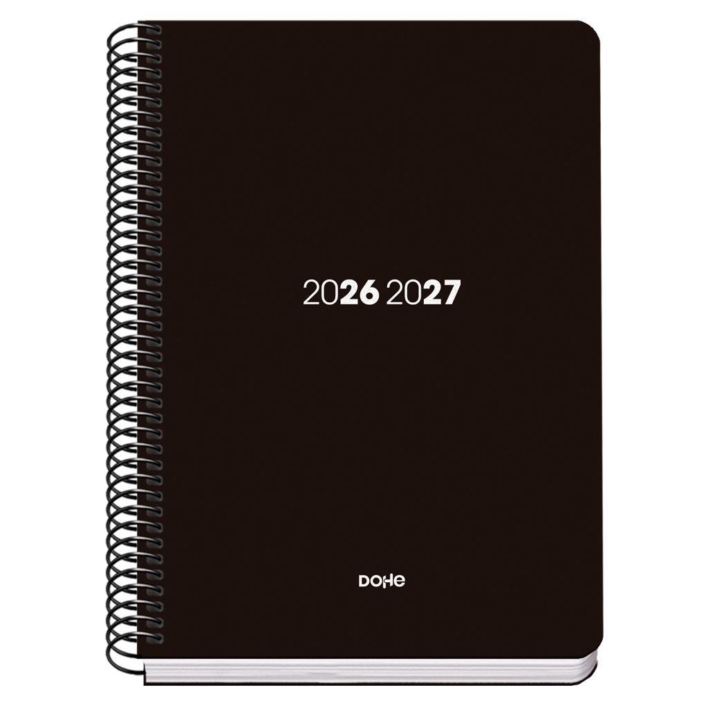 Agenda escolar semana vista con cubierta en cartón forrado con papel impreso a todo color y plastificado. Encuadernación en espiral metálico de color negro. Interior en papel offset de 70 gramos. Con Certificado FSC.