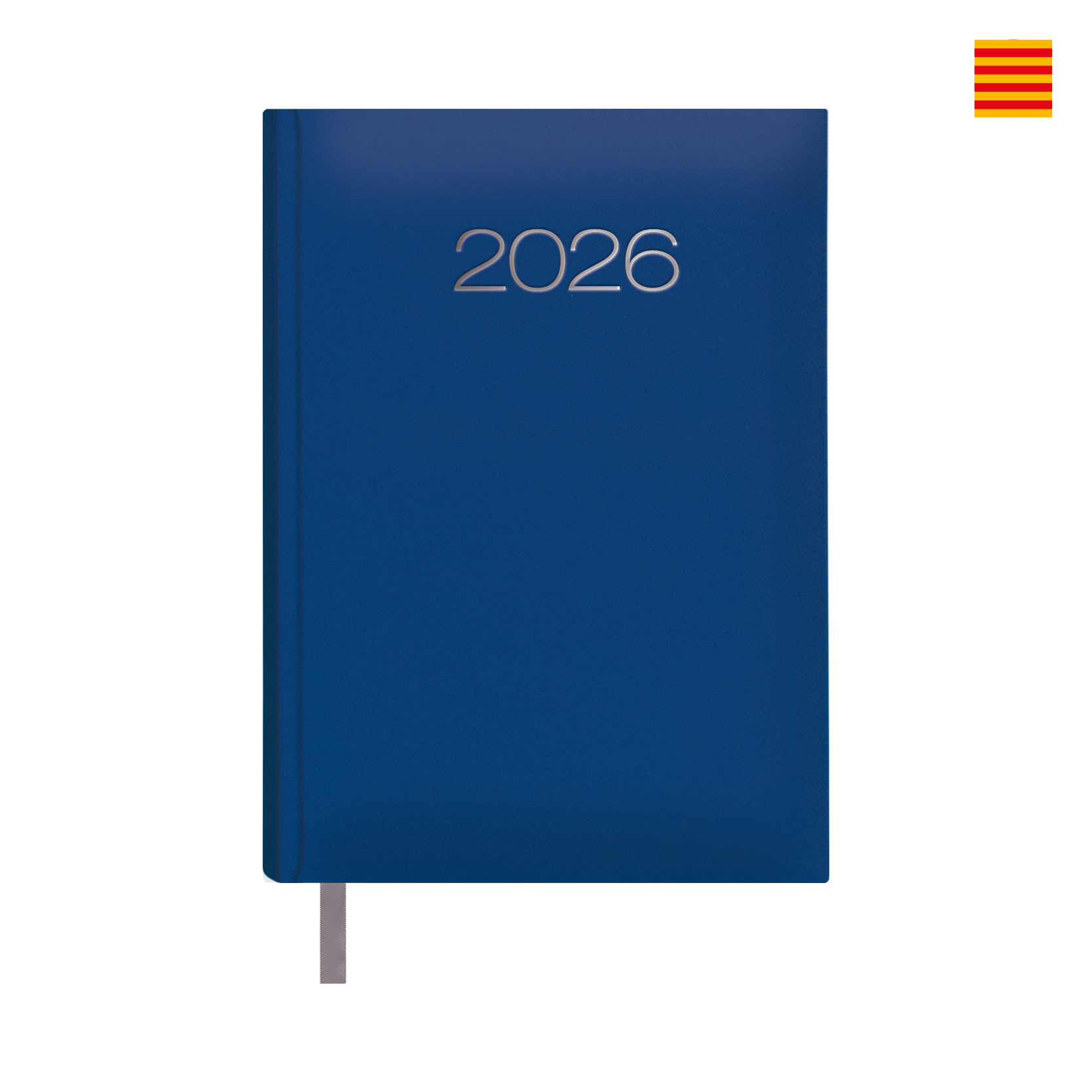 Agenda anual Catalán. Cubierta realizada en material polipiel con cartón contracolado de primera calidad y almohadillado. Interior con sábado y domingo en la misma página, impresa a un color en papel offset ahuesado de 70 grs., con 336 páginas. Datos personales, Calendario trienal, Planning del año, Páginas para anotaciones y Listín. Cabeceras en 5 idiomas (Castellano, Catalán, Gallego, Euskera y Portugués), Onomástica, Días transcurridos y restantes, Semana, Calendarios del mes actual y siguiente.