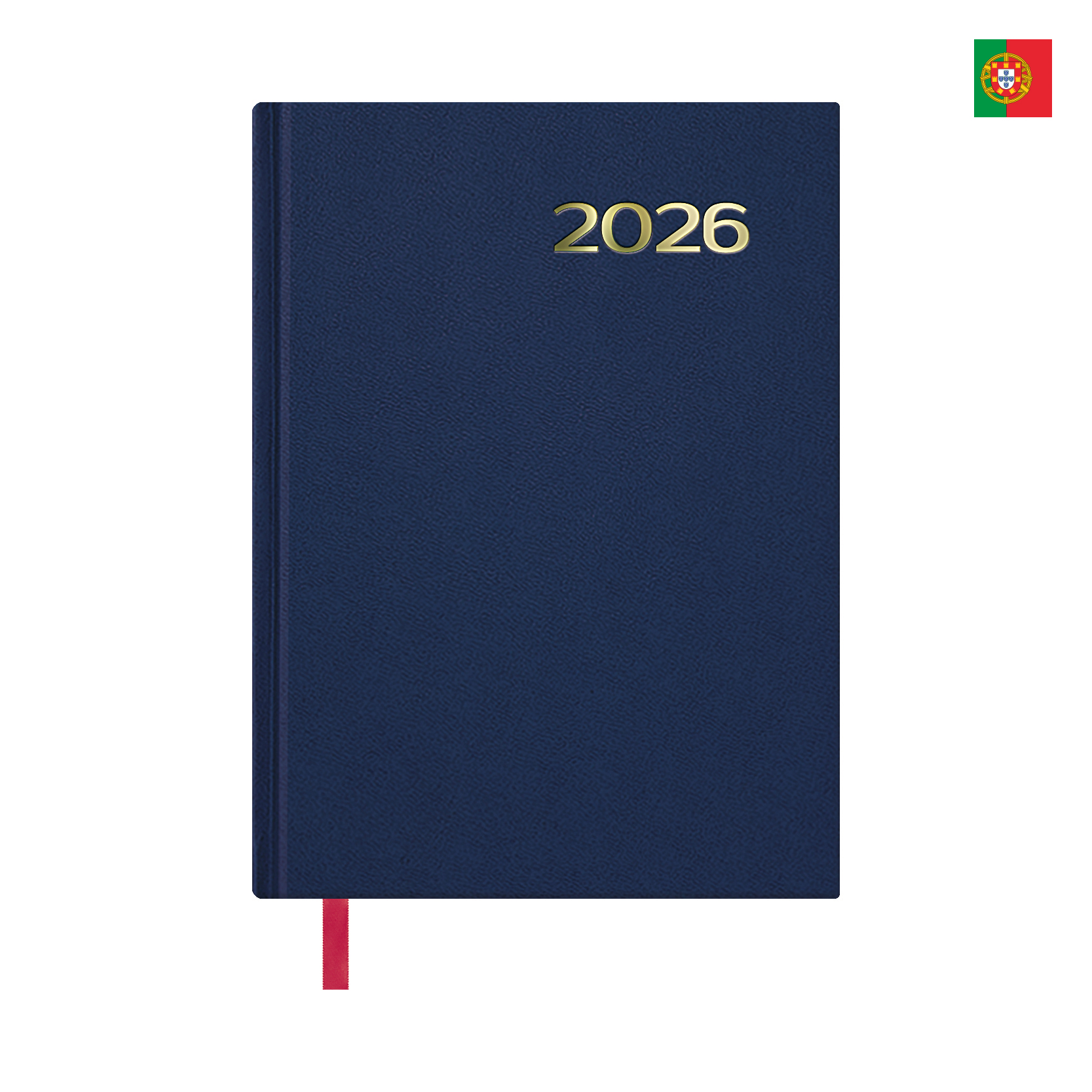 Agenda anual en Portugués. Cubierta realizada en material vinílico con cartón contracolado de primera calidad. Estampación del año con película de color ORO en la portada. Interior con sábado y domingo en la misma página, impresa a un color en papel offset blanco de 70 grs., con 288 páginas. Datos personales, Calendario trienal, Planning del año, Páginas para anotaciones y Listín. Días transcurridos y restantes, Semana, Calendarios del mes actual y siguiente.