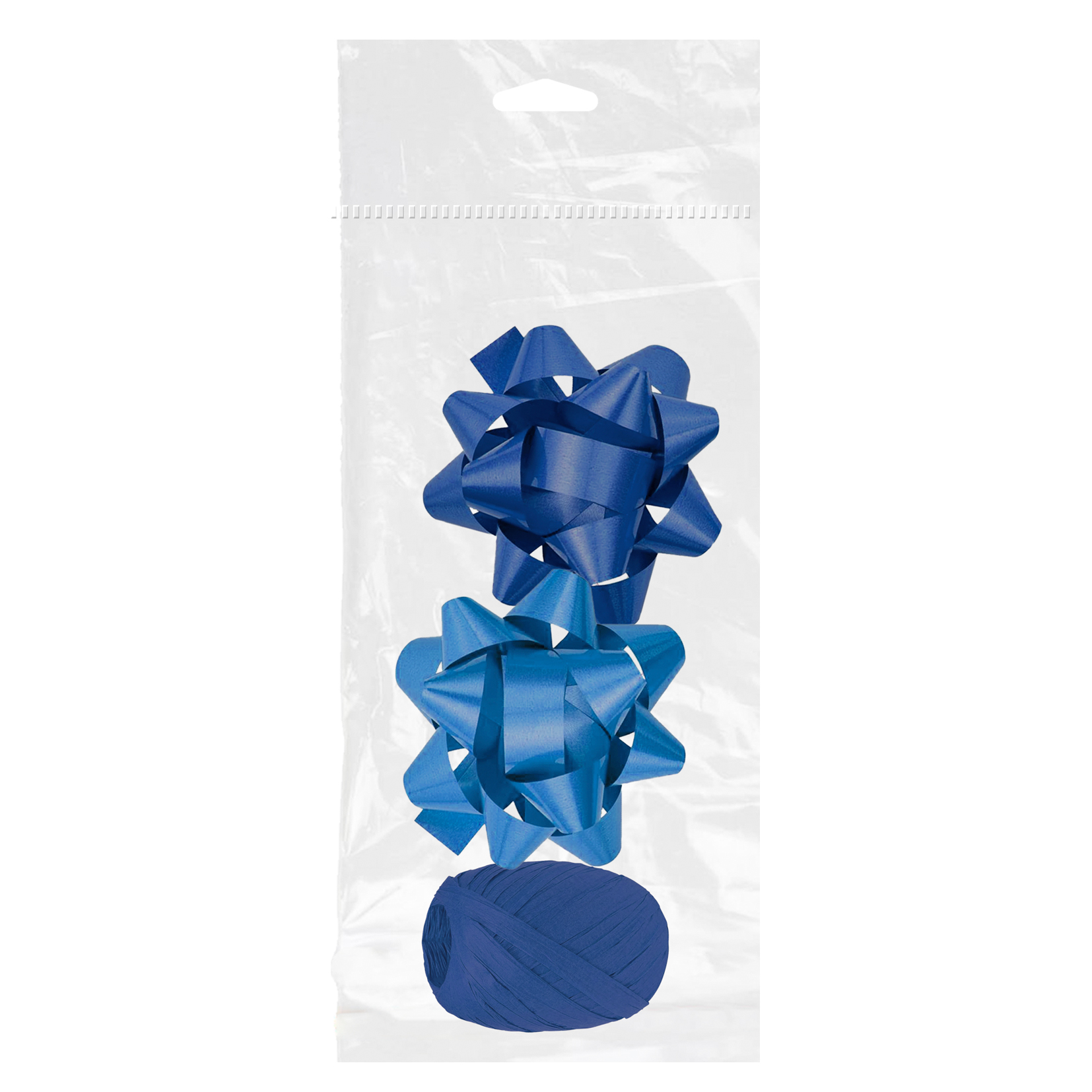 Set de dos ovillos en colores con acabado brillante para adornar paquetes, sobres y todo tipo de envoltorios para regalo. Realizado en polipropileno. En color Azul. Se sirve en blister de plástico.