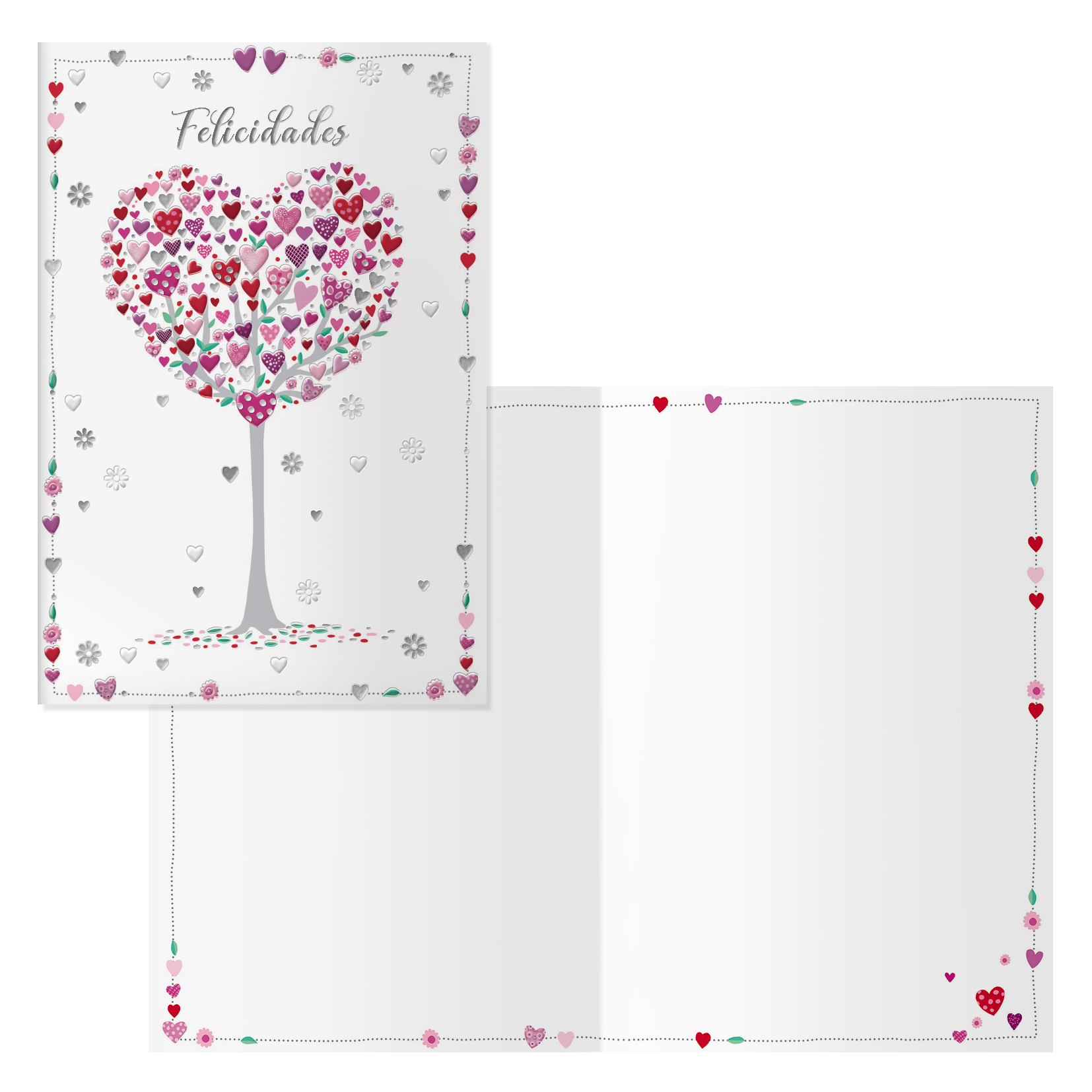 Tarjeta de felicitación de cumpleaños. Tamaño 11,5 x 17 cm cerradas (23 x 17 cm abiertas), impresas a todo color, con estampaciones con película de color y estampación en seco. Realizadas en papel offset blanco de 300 gr. Incluye sobre de color Cereza. Con certificado FSC Mixto.