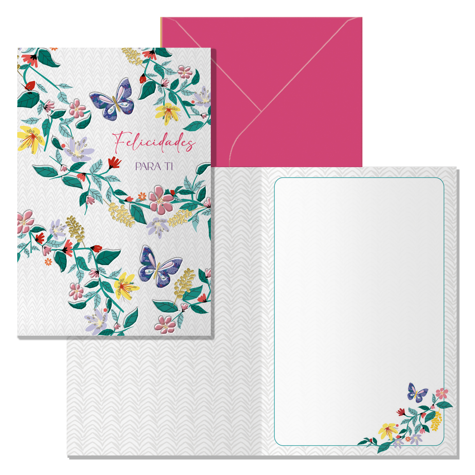 Tarjeta de felicitación de cumpleaños. Tamaño 11,5 x 17 cm cerradas (23 x 17 cm abiertas), impresas a todo color, con estampaciones con película de color y estampación con relieve. Realizadas en papel offset blanco de 300 gr. Incluye sobre de color. Con certificado FSC Mixto.