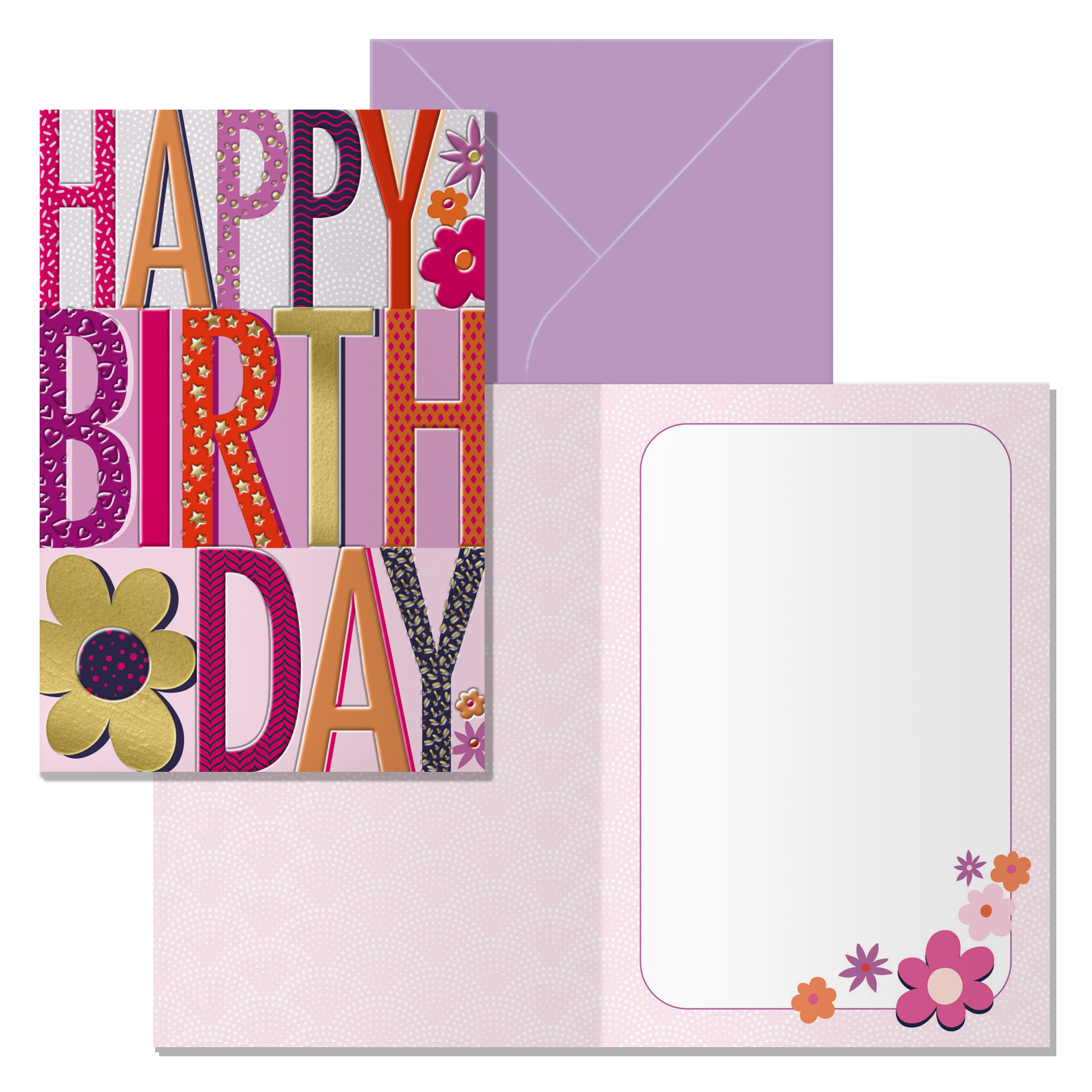 Tarjeta de felicitación de cumpleaños. Tamaño 11,5 x 17 cm cerradas (23 x 17 cm abiertas), impresas a todo color, con estampaciones con película de color y estampación con relieve. Realizadas en papel offset blanco de 300 gr. Incluye sobre de color. Con certificado FSC Mixto.