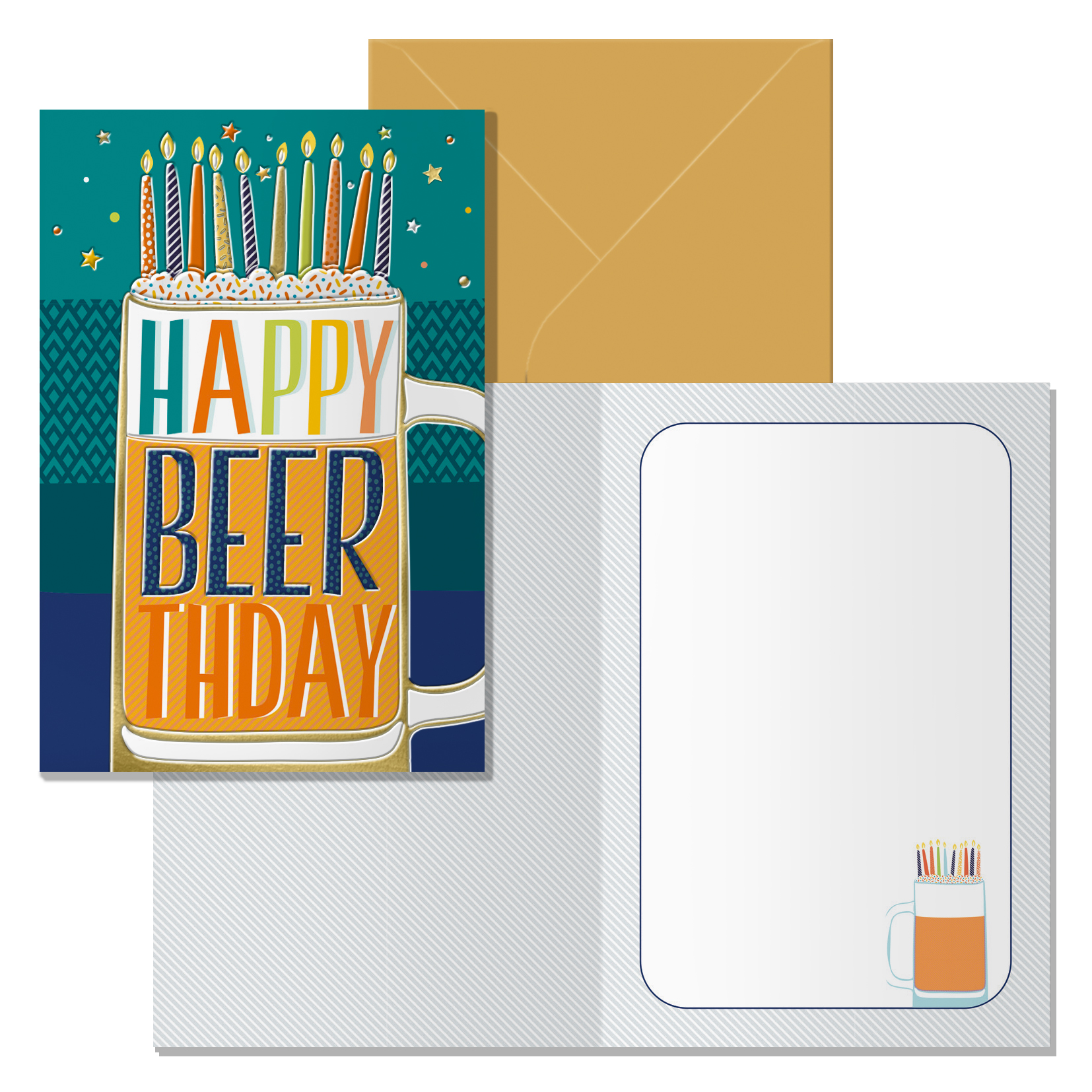 Tarjeta de felicitación de cumpleaños. Tamaño 11,5 x 17 cm cerradas (23 x 17 cm abiertas), impresas a todo color, con estampaciones con película de color y estampación con relieve. Realizadas en papel offset blanco de 300 gr. Incluye sobre de color. Con certificado FSC Mixto.