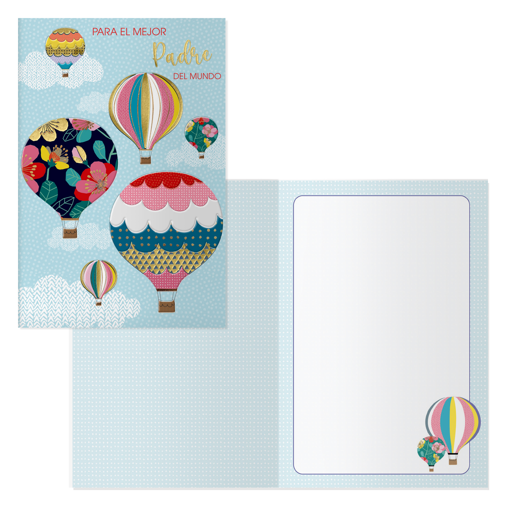 Tarjeta de Felicitación de Día del Padre. Tamaño 11,5 x 17 cm cerradas (23 x 17 cm abiertas), impresas a todo color, con estampaciones con película de color y estampación en seco. Realizadas en papel offset blanco de 300 gr. Incluye sobre de color. Con certificado FSC Mixto.