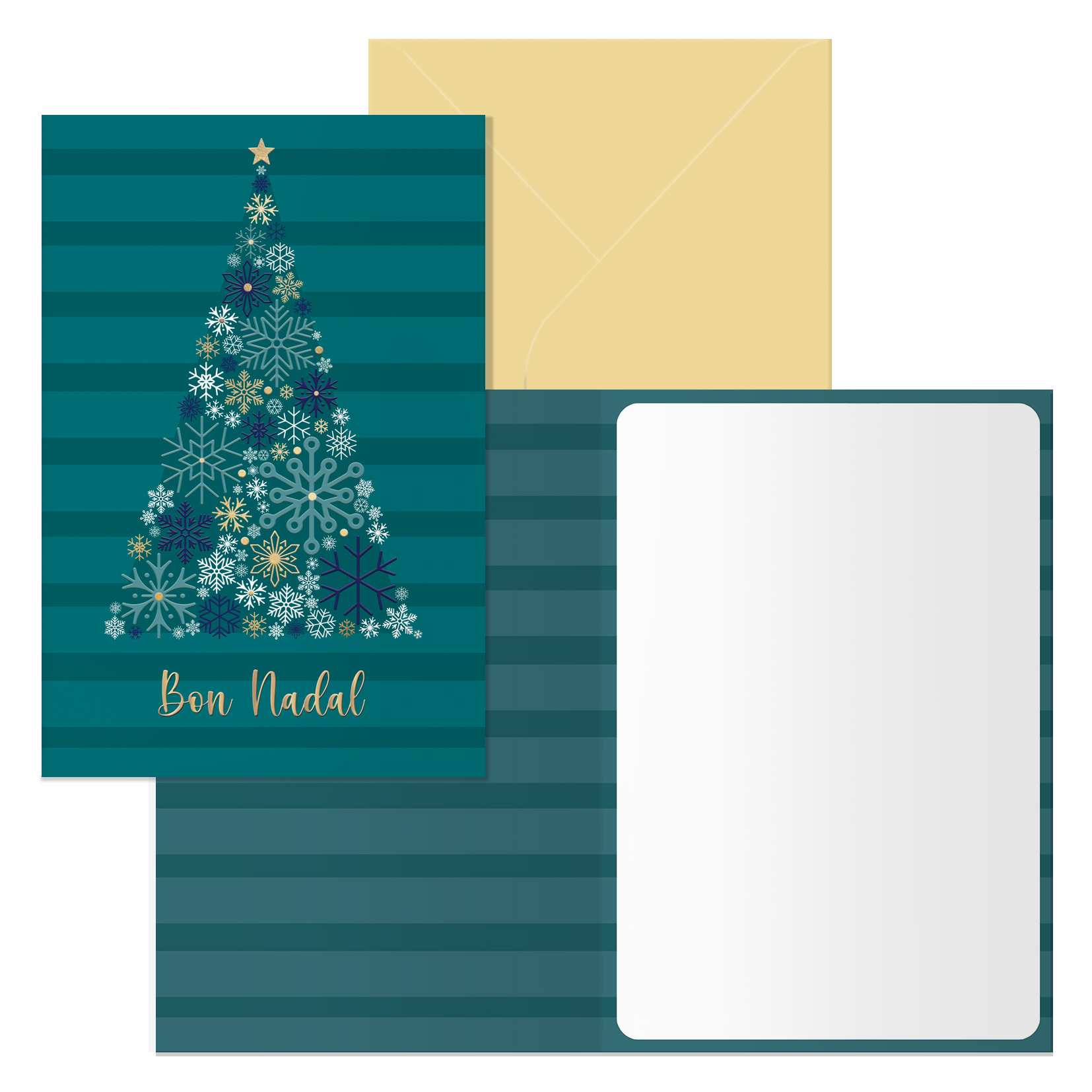 Tarjeta de felicitación navideña en catalán. Tamaño 11,5 x 17 cm cerradas (23 x 17 cm abiertas), impresas a todo color, con estampaciones con película de color y estampación en seco. Realizadas en papel offset blanco de 300 gr. Incluye sobre de color. Con certificado FSC Mixto.