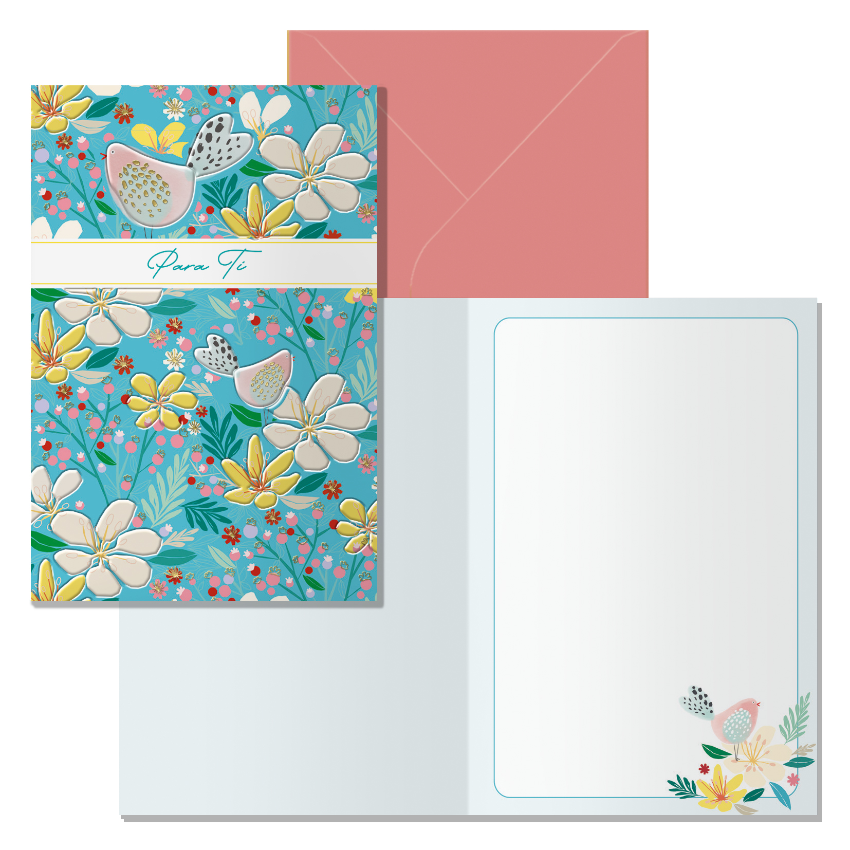 Tarjeta de felicitación. Tamaño 11,5 x 17 cm cerradas (23 x 17 cm abiertas), impresas a todo color, con estampaciones con película de color y estampación con relieve. Realizadas en papel offset blanco de 300 gr. Incluye sobre de color. Con certificado FSC Mixto.
